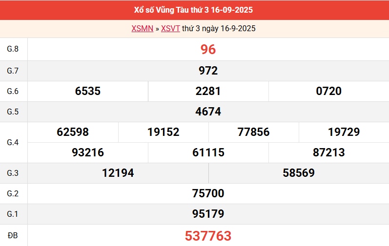 Bảng kết quả Vũng Tàu ngày 16/9/2025 tuần trước