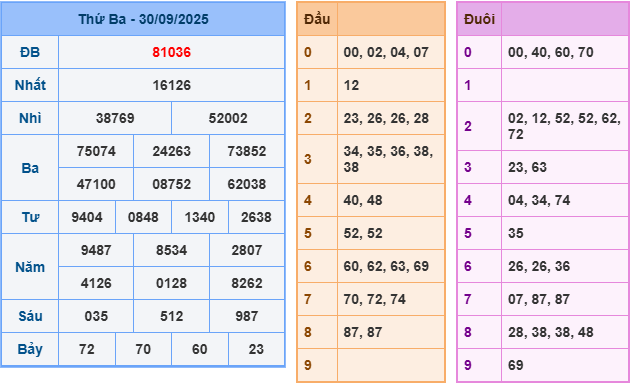 Hôm qua đặc biệt 81036 → số hôm nay: 63, 36.