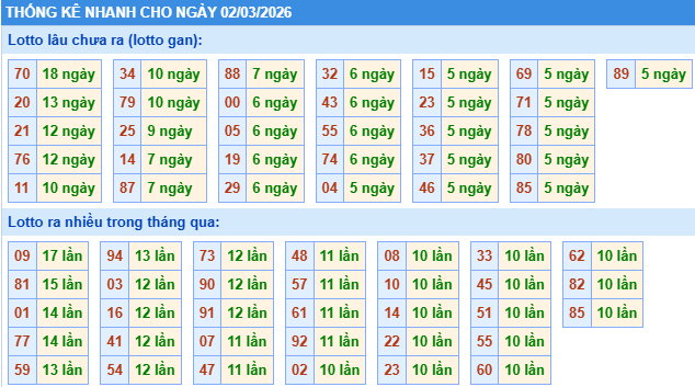 Bảng tần suất lô tô miền bắc ngày 02/03/2026