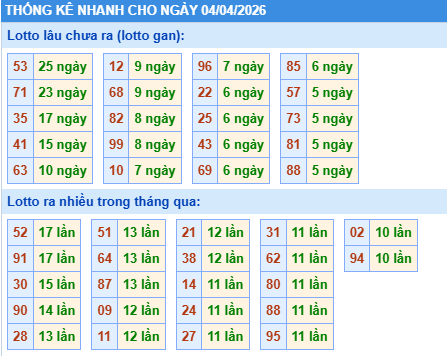 Thống kê loto miền Bắc ngày 04/04/2026 chính xác 100% bao gồm: XSMB 100, 90, 60, 30 ngày qua, Tần suất LOTO,,... giúp bạn dễ dàng loại bỏ những bộ số không nên đánh trong ngày.