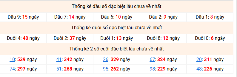 ⚡ Đầu - đuôi đặc biệt lâu chưa ra nhất: Đầu 9 (15 ngày) - Đuôi 4 (40 ngày)