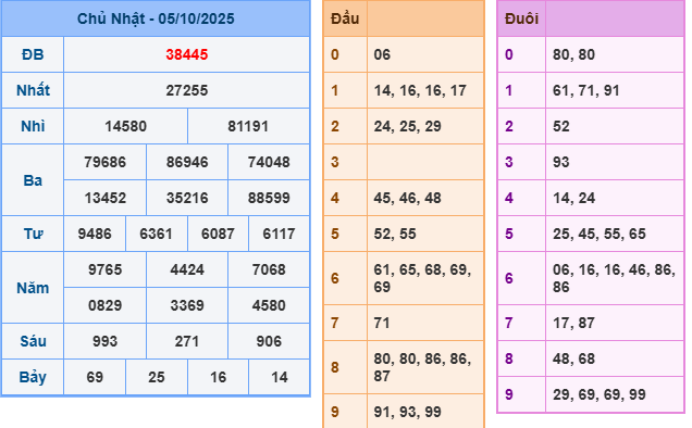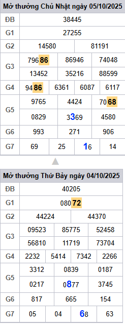 Bảng kết quả hôm qua ngày 05/10/2025