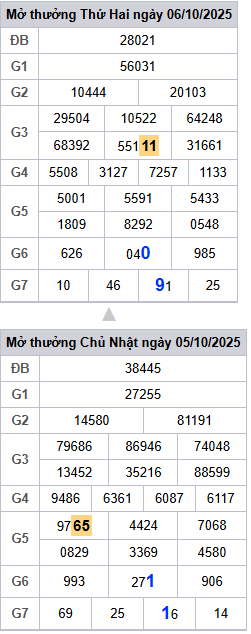 Bảng kết quả hôm qua ngày 06/10/2025
