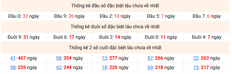 ⚡ Đầu - đuôi đặc biệt lâu chưa ra nhất: Đầu 0 (33 ngày) - Đuôi 9 (31 ngày)