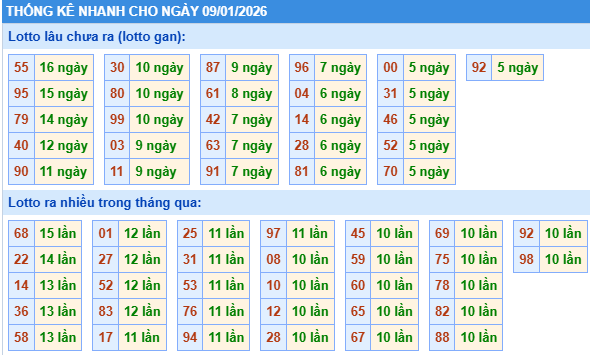 Thống kê loto miền Bắc ngày 09/01/2026 chính xác 100% bao gồm: XSMB 100, 90, 60, 30 ngày qua, Tần suất LOTO,,... giúp bạn dễ dàng loại bỏ những bộ số không nên đánh trong ngày.