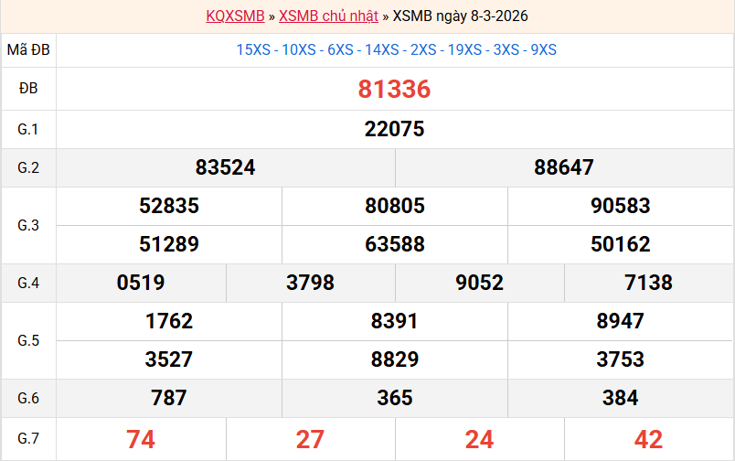 Bảng kết quả hôm qua ngày 08/03/2026