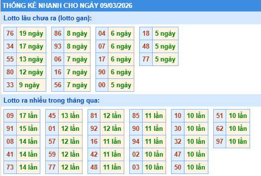 Bảng tần suất lô tô miền bắc ngày 09/03/2026