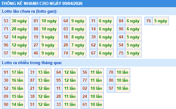 Thống kê loto miền Bắc ngày 09/04/2026 chính xác 100% bao gồm: XSMB 100, 90, 60, 30 ngày qua, Tần suất LOTO,,... giúp bạn dễ dàng loại bỏ những bộ số không nên đánh trong ngày.