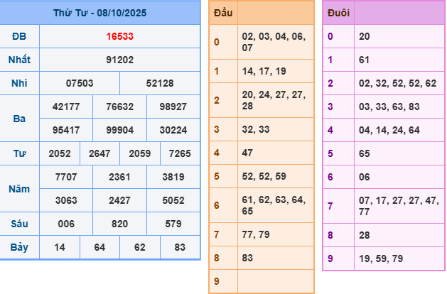 Từ bảng tổng hợp kết quả 08/10/2025, ta phân tích được các dữ liệu quan trọng như sau: