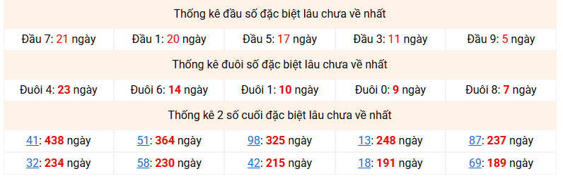 ⚡ Đầu - đuôi đặc biệt lâu chưa ra nhất: Đầu 7 (21 ngày) - Đuôi 4 (23 ngày)