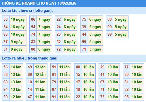 Thống kê loto miền Bắc ngày 10/02/2026 chính xác 100% bao gồm: XSMB 100, 90, 60, 30 ngày qua, Tần suất LOTO,,... giúp bạn dễ dàng loại bỏ những bộ số không nên đánh trong ngày.