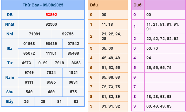 Kết quả đặc biệt ra 53892 → Gợi ý số hôm nay: 80, 08.