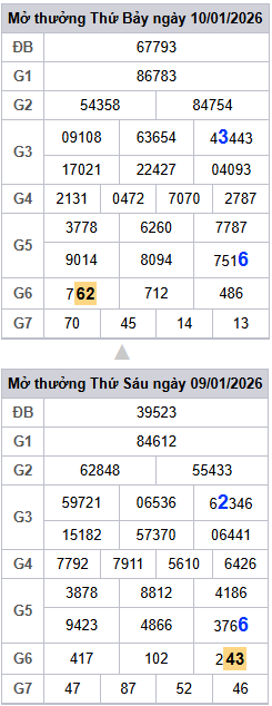 Bảng kết quả hôm qua ngày 10/01/2026
