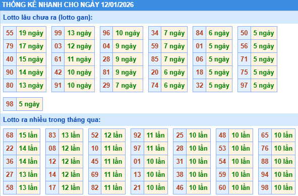 Thống kê loto miền Bắc ngày 12/01/2026 chính xác 100% bao gồm: XSMB 100, 90, 60, 30 ngày qua, Tần suất LOTO,,... giúp bạn dễ dàng loại bỏ những bộ số không nên đánh trong ngày.