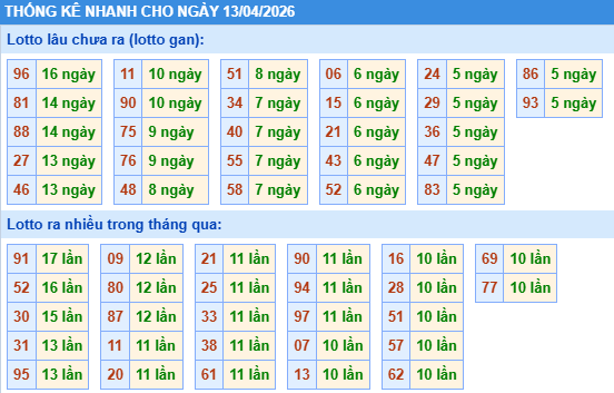 Thống kê loto miền Bắc ngày 13/04/2026 chính xác 100% bao gồm: XSMB 100, 90, 60, 30 ngày qua, Tần suất LOTO,,... giúp bạn dễ dàng loại bỏ những bộ số không nên đánh trong ngày.