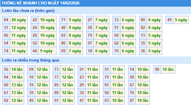 Thống kê loto miền Bắc ngày 14/02/2026 chính xác 100% bao gồm: XSMB 100, 90, 60, 30 ngày qua, Tần suất LOTO,,... giúp bạn dễ dàng loại bỏ những bộ số không nên đánh trong ngày.