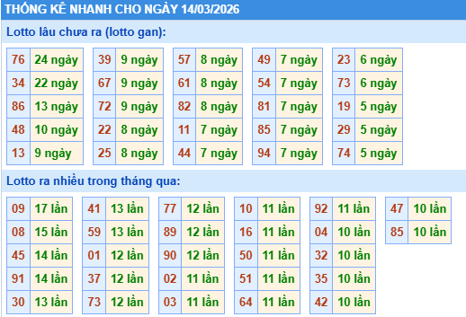 Bảng tần suất lô tô miền bắc ngày 14/03/2026