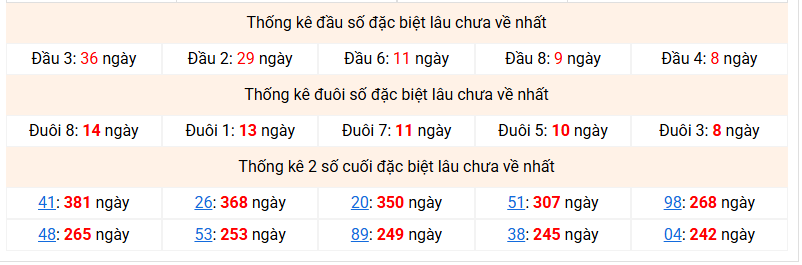 ⚡ Đầu - đuôi đặc biệt lâu chưa ra nhất: Đầu 3 (36 ngày) - Đuôi 8 (14 ngày)
