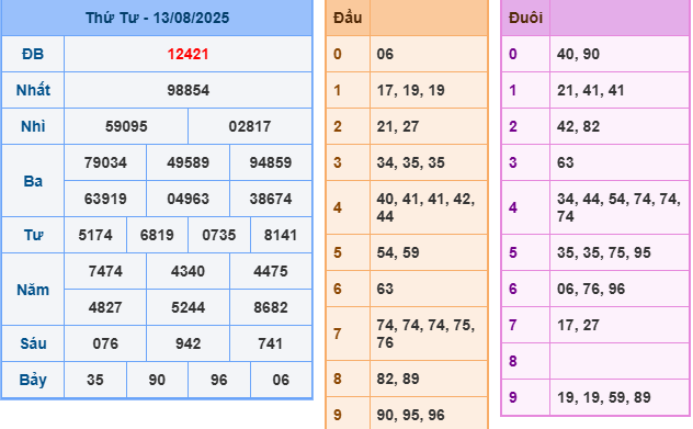 Từ bảng tổng hợp kết quả 13/8/2025, ta phân tích được các dữ liệu quan trọng như sau: