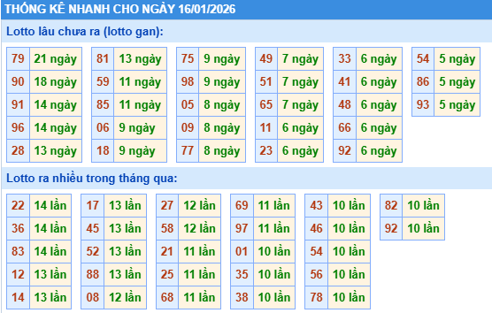Thống kê loto miền Bắc ngày 16/01/2026 chính xác 100% bao gồm: XSMB 100, 90, 60, 30 ngày qua, Tần suất LOTO,,... giúp bạn dễ dàng loại bỏ những bộ số không nên đánh trong ngày.