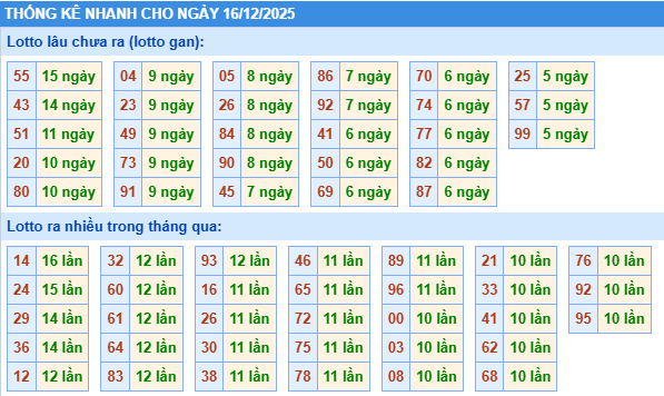 Thống kê loto miền Bắc ngày 16/12/2025 chính xác 100% bao gồm: XSMB 100, 90, 60, 30 ngày qua, Tần suất LOTO,,... giúp bạn dễ dàng loại bỏ những bộ số không nên đánh trong ngày.