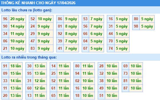 Thống kê loto miền Bắc ngày 17/04/2026 chính xác 100% bao gồm: XSMB 100, 90, 60, 30 ngày qua, Tần suất LOTO,,... giúp bạn dễ dàng loại bỏ những bộ số không nên đánh trong ngày.