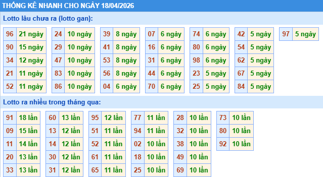 Thống kê loto miền Bắc ngày 18/04/2026 chính xác 100% bao gồm: XSMB 100, 90, 60, 30 ngày qua, Tần suất LOTO,,... giúp bạn dễ dàng loại bỏ những bộ số không nên đánh trong ngày.
