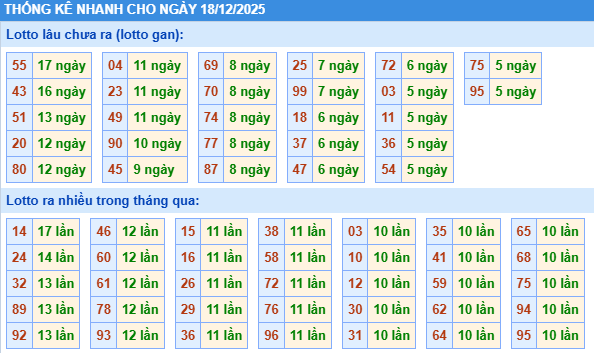 Thống kê loto miền Bắc ngày 18/12/2025 chính xác 100% bao gồm: XSMB 100, 90, 60, 30 ngày qua, Tần suất LOTO,,... giúp bạn dễ dàng loại bỏ những bộ số không nên đánh trong ngày.