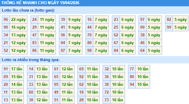 Thống kê loto miền Bắc ngày 19/04/2026 chính xác 100% bao gồm: XSMB 100, 90, 60, 30 ngày qua, Tần suất LOTO,,... giúp bạn dễ dàng loại bỏ những bộ số không nên đánh trong ngày.