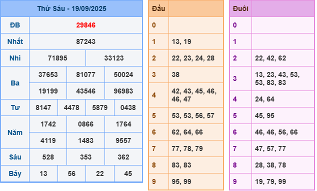 Bảng thống kê 2 số cuối đặc biệt gan ngày 20/9