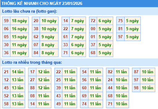 Thống kê loto miền Bắc ngày 23/01/2026 chính xác 100% bao gồm: XSMB 100, 90, 60, 30 ngày qua, Tần suất LOTO,,... giúp bạn dễ dàng loại bỏ những bộ số không nên đánh trong ngày.