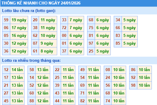 Thống kê loto miền Bắc ngày 24/01/2026 chính xác 100% bao gồm: XSMB 100, 90, 60, 30 ngày qua, Tần suất LOTO,,... giúp bạn dễ dàng loại bỏ những bộ số không nên đánh trong ngày.