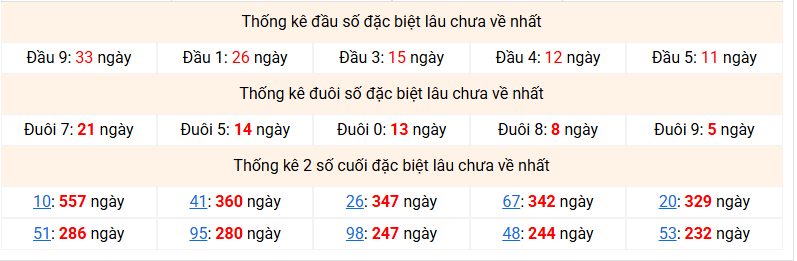 ⚡ Đầu - đuôi đặc biệt lâu chưa ra nhất: Đầu 9 (33 ngày) - Đuôi 7 (21 ngày)