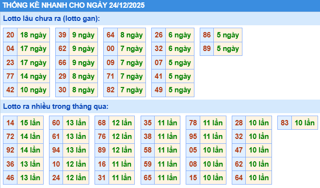 Thống kê loto miền Bắc ngày 24/12/2025 chính xác 100% bao gồm: XSMB 100, 90, 60, 30 ngày qua, Tần suất LOTO,,... giúp bạn dễ dàng loại bỏ những bộ số không nên đánh trong ngày.