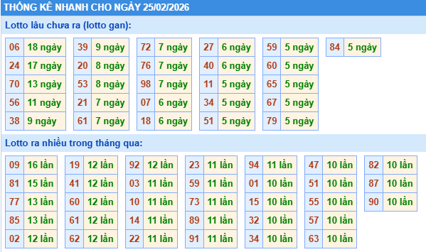 Thống kê loto miền Bắc ngày 25/02/2026 chính xác 100% bao gồm: XSMB 100, 90, 60, 30 ngày qua, Tần suất LOTO,,... giúp bạn dễ dàng loại bỏ những bộ số không nên đánh trong ngày.