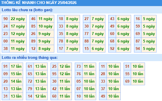 Thống kê loto miền Bắc ngày 25/04/2026 chính xác 100% bao gồm: XSMB 100, 90, 60, 30 ngày qua, Tần suất LOTO,,... giúp bạn dễ dàng loại bỏ những bộ số không nên đánh trong ngày.