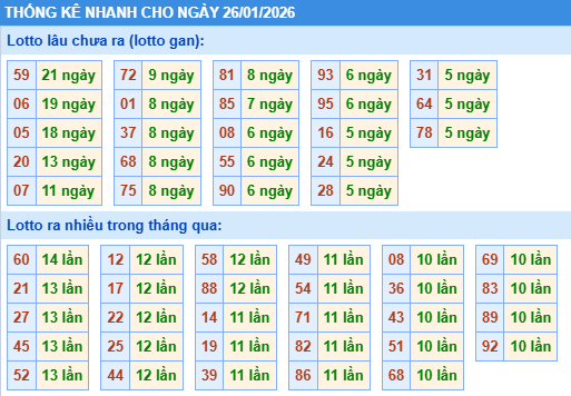 Thống kê loto miền Bắc ngày 26/01/2026 chính xác 100% bao gồm: XSMB 100, 90, 60, 30 ngày qua, Tần suất LOTO,,... giúp bạn dễ dàng loại bỏ những bộ số không nên đánh trong ngày.