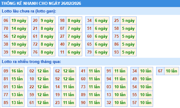 Thống kê loto miền Bắc ngày 26/02/2026 chính xác 100% bao gồm: XSMB 100, 90, 60, 30 ngày qua, Tần suất LOTO,,... giúp bạn dễ dàng loại bỏ những bộ số không nên đánh trong ngày.