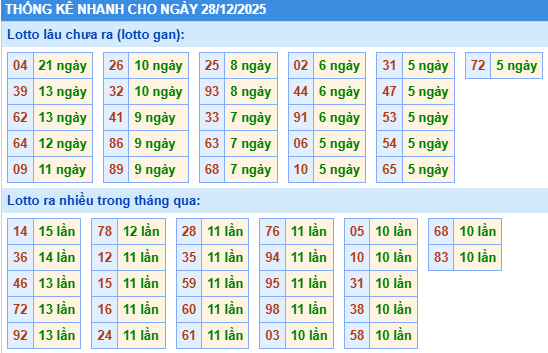 Thống kê loto miền Bắc ngày 28/12/2025 chính xác 100% bao gồm: XSMB 100, 90, 60, 30 ngày qua, Tần suất LOTO,,... giúp bạn dễ dàng loại bỏ những bộ số không nên đánh trong ngày.