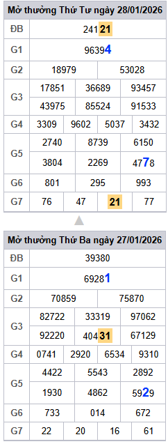 Bảng kết quả hôm qua ngày 28/01/2026