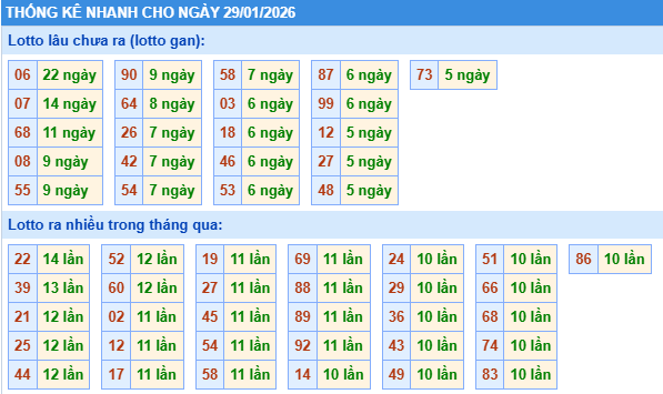 Bảng tần suất lô tô miền bắc ngày 29/01/2026