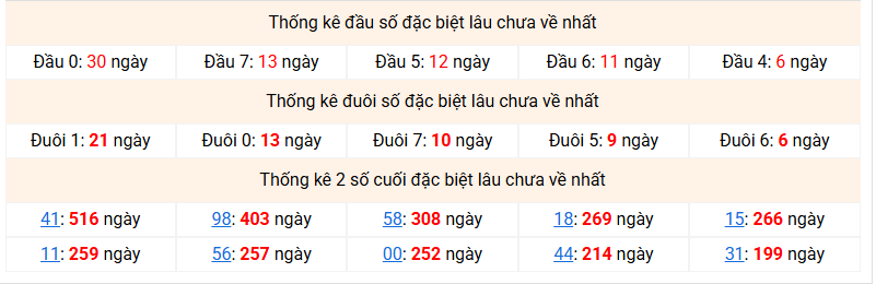 ⚡ Đầu - đuôi đặc biệt lâu chưa ra nhất: Đầu 0 (30 ngày) - Đuôi 1 (21 ngày)