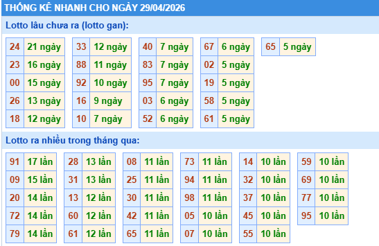 Thống kê loto miền Bắc ngày 29/04/2026 chính xác 100% bao gồm: XSMB 100, 90, 60, 30 ngày qua, Tần suất LOTO,,... giúp bạn dễ dàng loại bỏ những bộ số không nên đánh trong ngày.