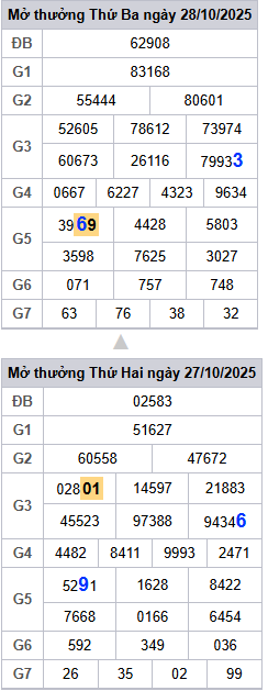 ⚡ Cặp số lô tô về nhiều nhất: 02 - 28 - 27 - 68 - 69