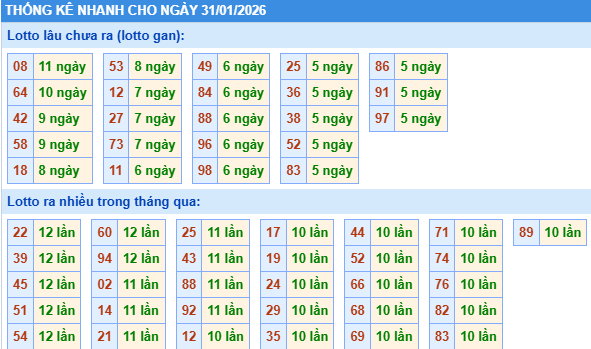 Thống kê loto miền Bắc ngày 31/01/2026 chính xác 100% bao gồm: XSMB 100, 90, 60, 30 ngày qua, Tần suất LOTO,,... giúp bạn dễ dàng loại bỏ những bộ số không nên đánh trong ngày.
