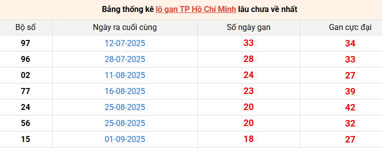 Bảng thống kê lô gan Hồ Chí Minh lâu về nhất 08/11/2025
