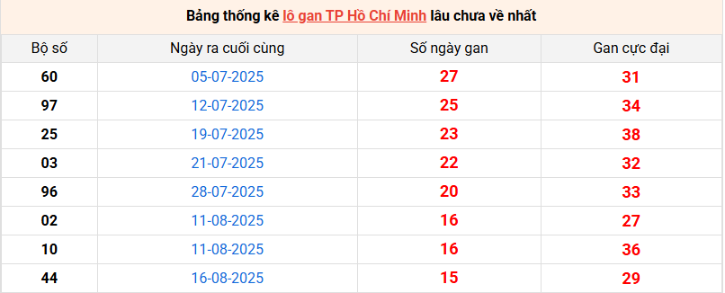 Bảng thống kê lô gan Hồ Chí Minh lâu về nhất 11/10/2025