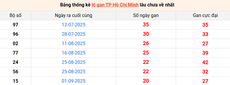 Bảng thống kê lô gan Hồ Chí Minh lâu về nhất 15/11/2025