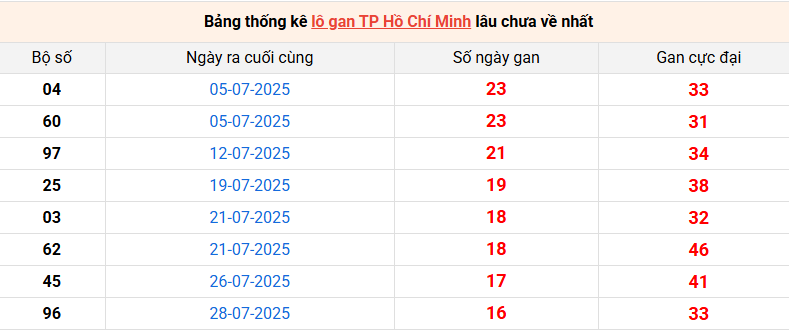Bảng thống kê lô gan Hồ Chí Minh lâu về nhất 27/9/2025
