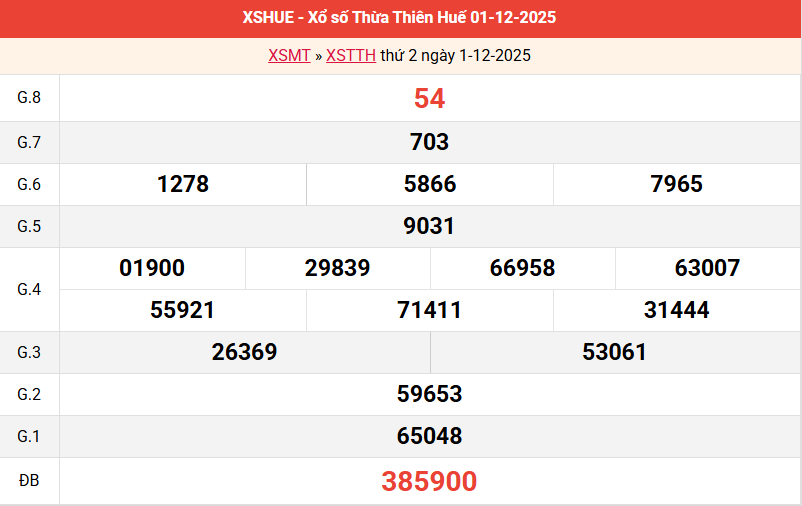 Bảng kết quả Huế ngày 01/12/2025 tuần trước